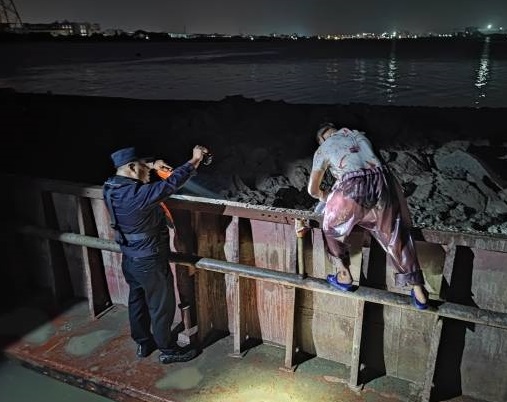 當(dāng)晚9時(shí)50分,由中山市海洋綜合執(zhí)法支隊(duì)支隊(duì)長梁灶帶領(lǐng)隊(duì),一眾聯(lián)合執(zhí)法人員從橫門漁港出發(fā)開始突擊巡查。當(dāng)巡查至洪奇瀝沙仔碼頭至屎船沙海域時(shí),發(fā)現(xiàn)1艘抓斗式采砂船“粵新會(huì)工8179”正在作業(yè)。執(zhí)法人員立即靠近準(zhǔn)備登船檢查,該采砂船見執(zhí)法船艇靠近馬上停止作業(yè)并關(guān)閉照明設(shè)備,意圖逃避查處。執(zhí)法人員迅速登船查看,發(fā)現(xiàn)該采砂船及系泊的“粵清遠(yuǎn)貨3390”運(yùn)泥船泥水濕潤,有明顯的采砂痕跡,運(yùn)輸船上載有泥沙混合物約200立方米,船上負(fù)責(zé)人辯稱正在進(jìn)行航道疏浚,執(zhí)法人員要求其提供相關(guān)資料,該負(fù)責(zé)人無法提供。